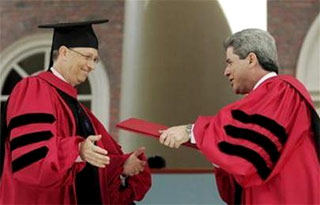 "Ông là doanh nhân có ảnh hưởng nhất trong cuộc cách mạng máy tính cá nhân", Derek Bok, người điều hành buổi lễ phát bằng hôm 7/6, tuyên bố rồi quay sang nói với Gates. "Làm sao anh giành được danh hiệu đó nếu cố học thêm 2 năm nữa nhỉ"